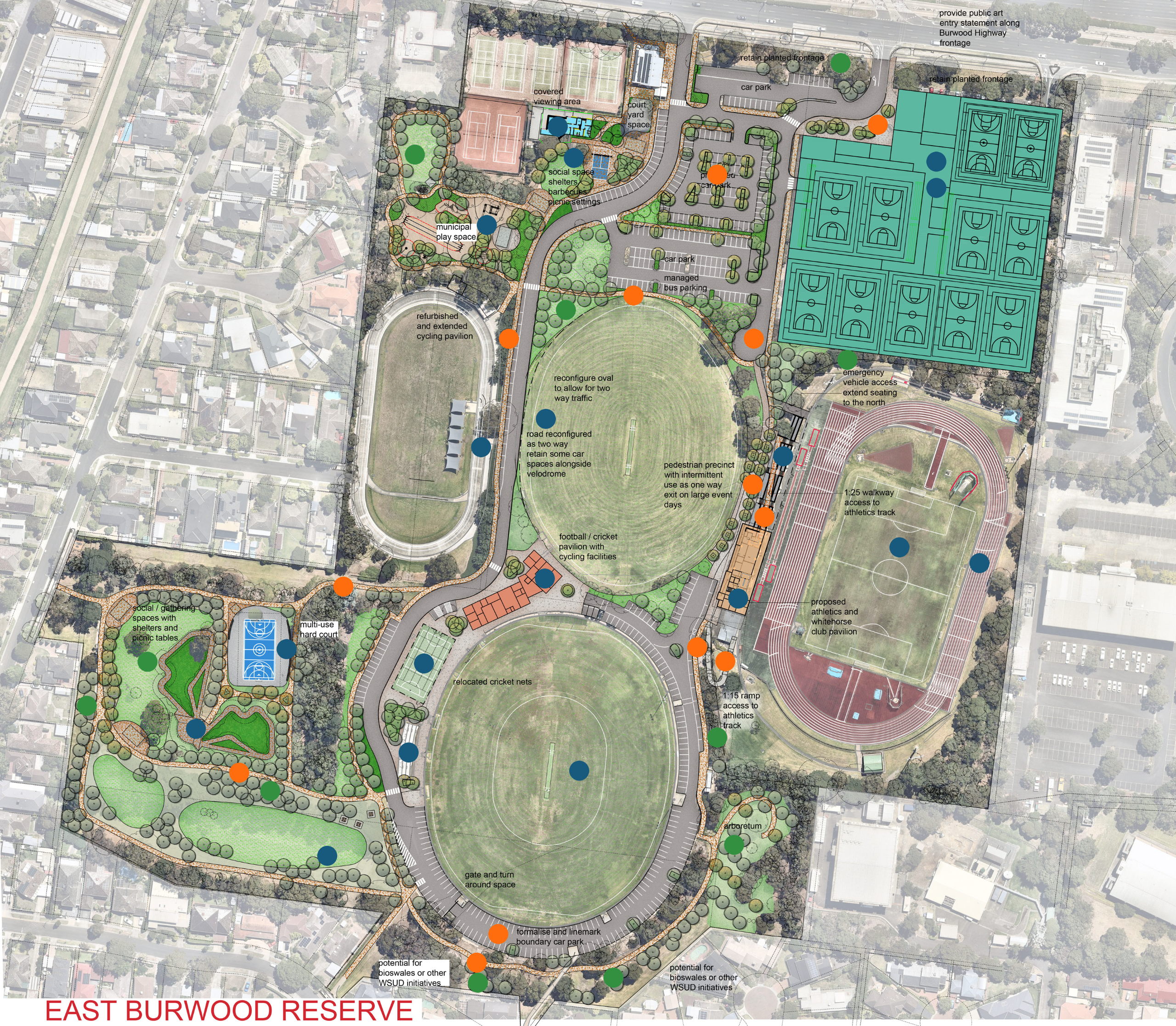 East Burwood Reserve is a major sporting and recreation reserve located on Council-owned land in Burwood East. The reserve supports a wide range of organised sport and community activities and includes sporting ovals, athletics and cycling facilities, tennis courts, indoor basketball facilities, pavilions, open space areas and supporting infrastructure.